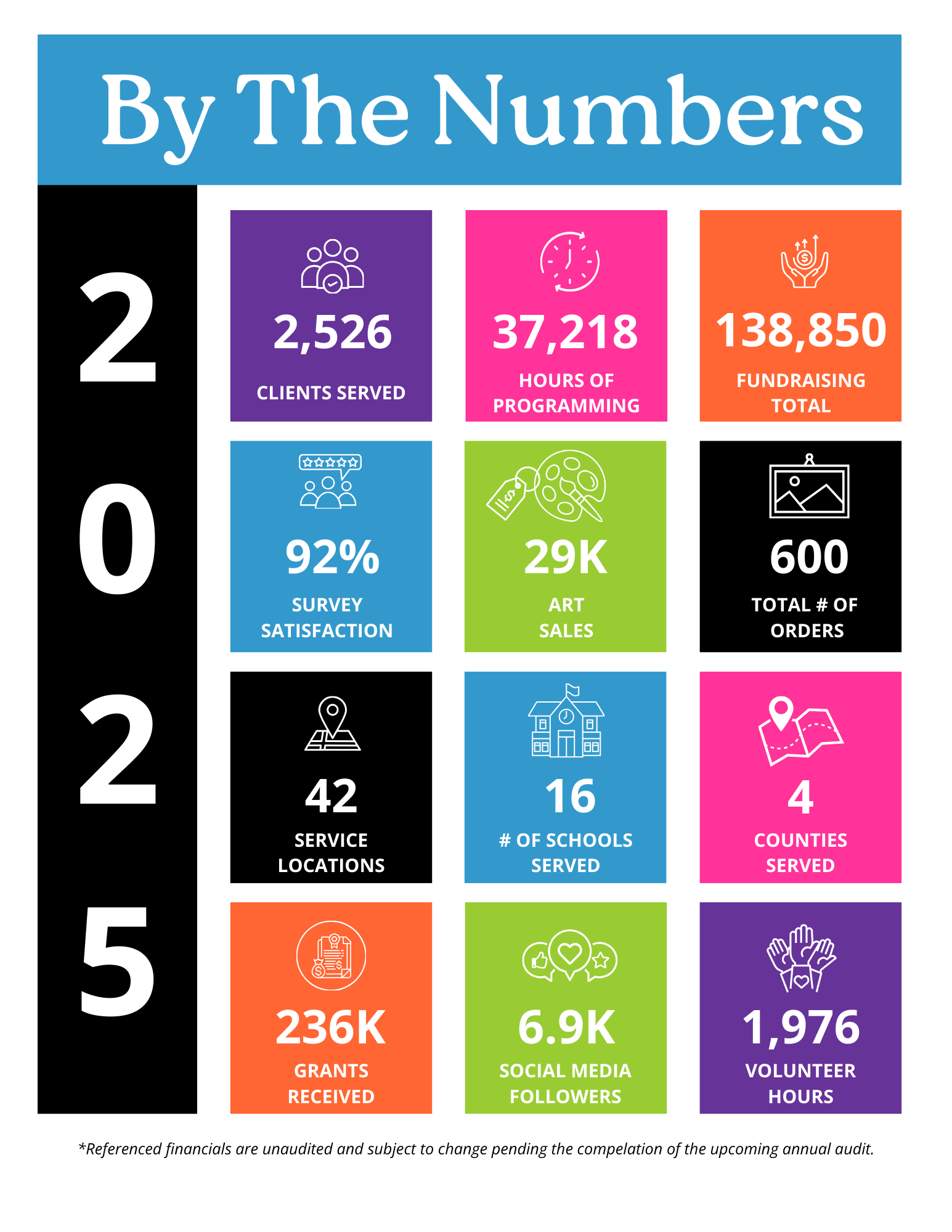 Explore the By The Numbers 2025 impact report to see the effort that contributed to a successful year at We Care Arts.