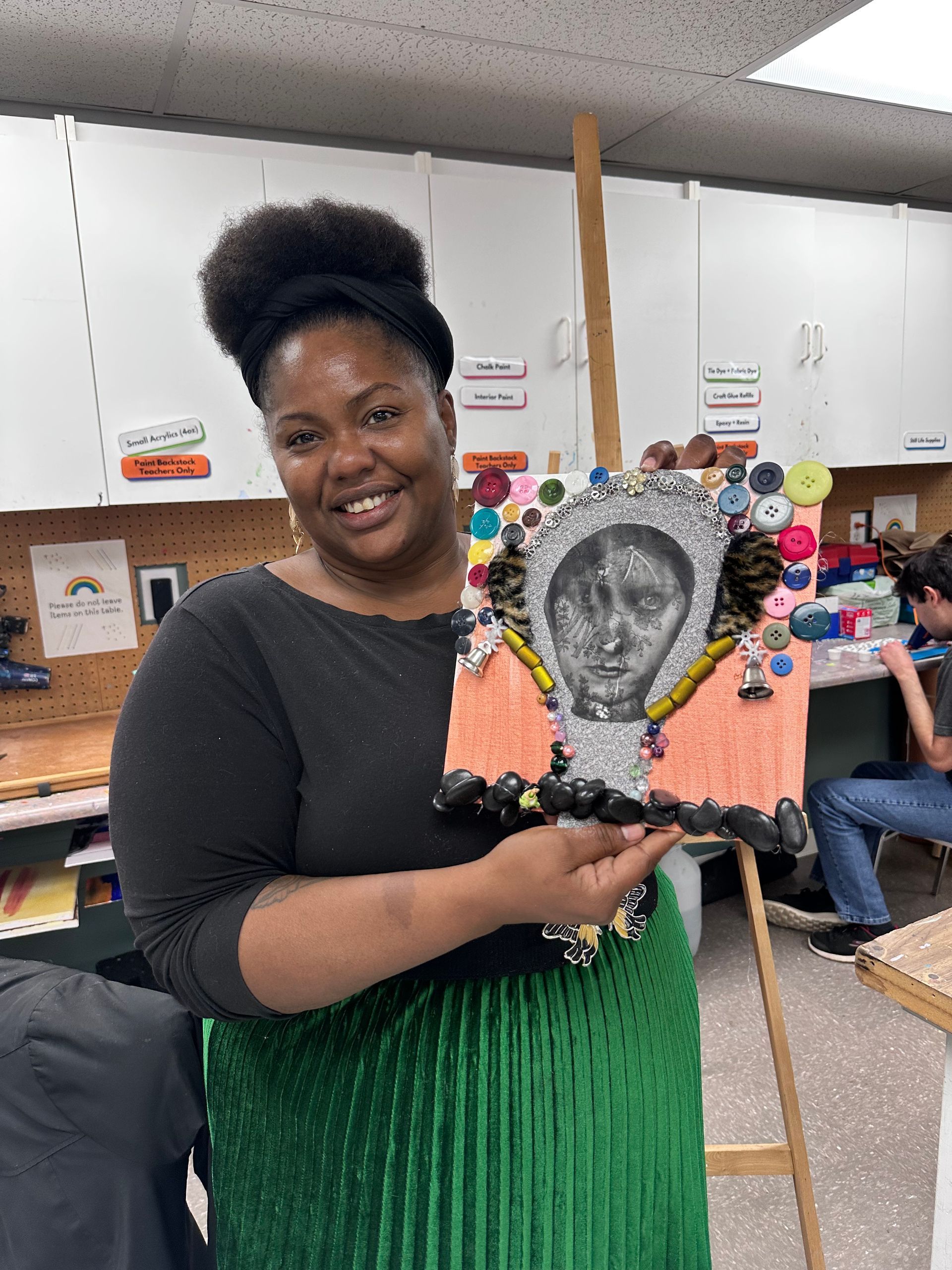 Cindy’s teacher, Leesa Haapapauro, has been an influential figure in her artistic development. Leesa first met Cindy many years ago in a sculpture class at Sinclair College. "She impressed me back then with her eagerness to experiment with different materials and learn new techniques," recalls Leesa. Reconnecting at We Care Arts has been a joy for both, as Cindy continues to impress with her varied studio practice, which includes drawing, painting, and jewelry making.