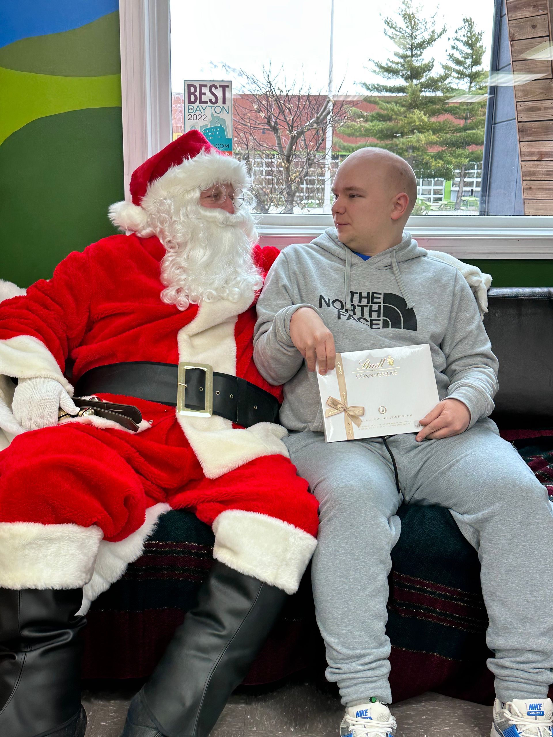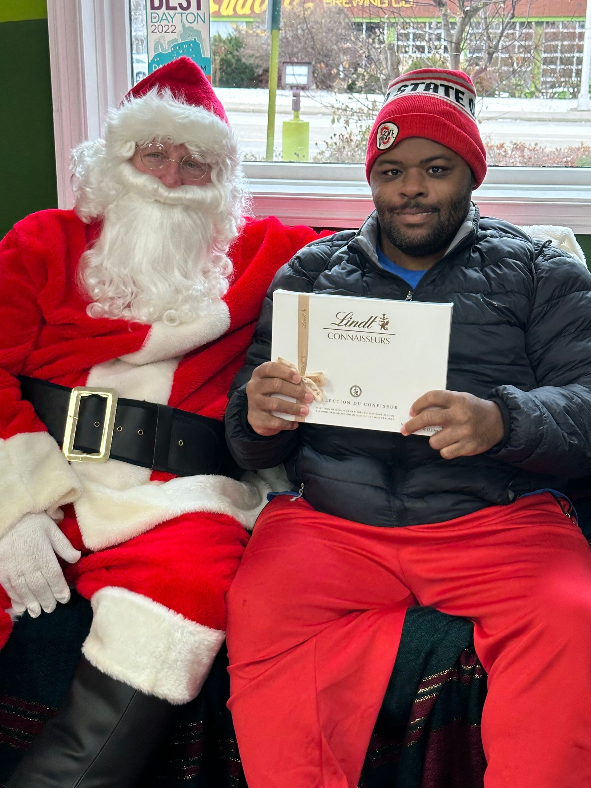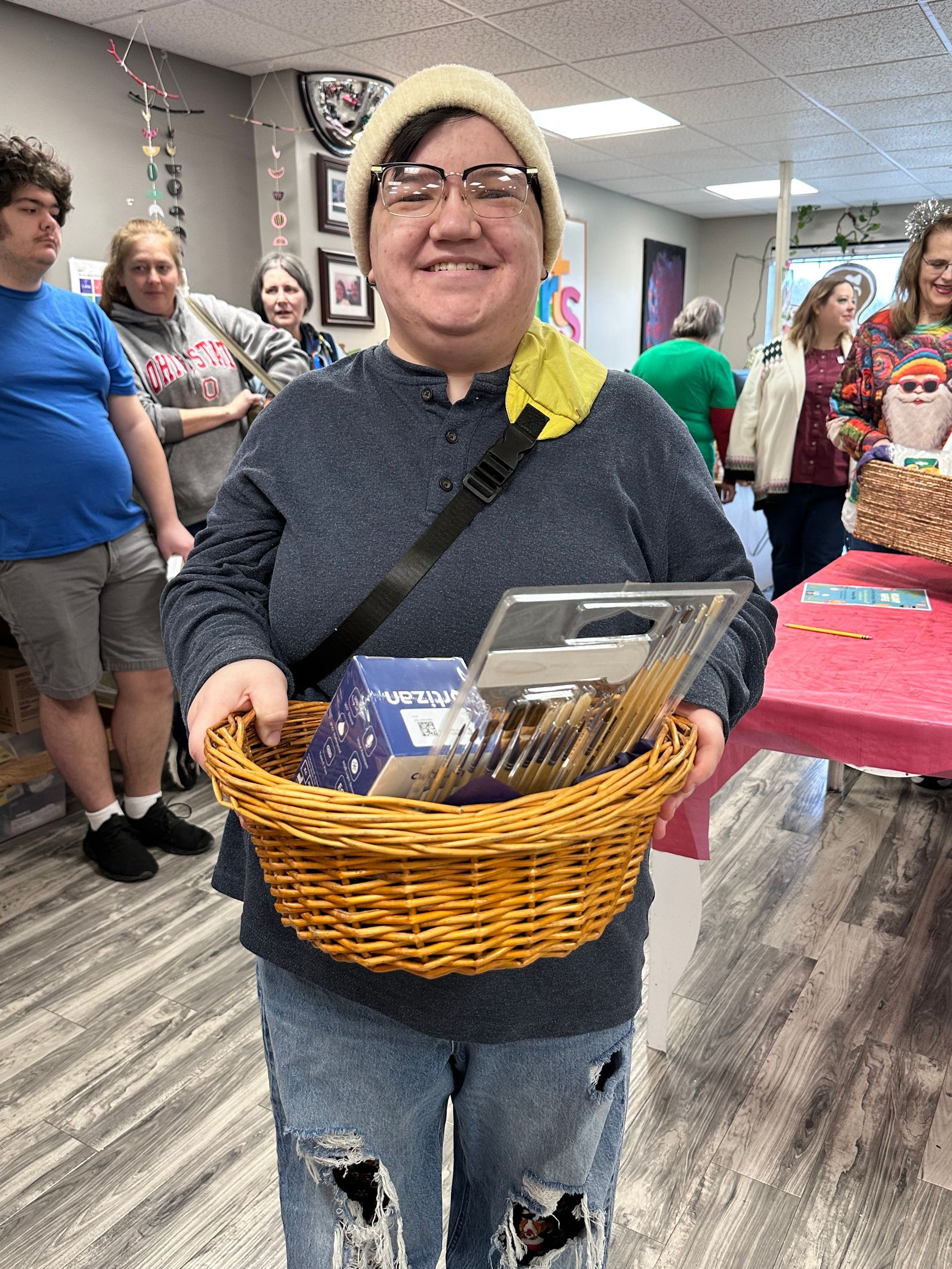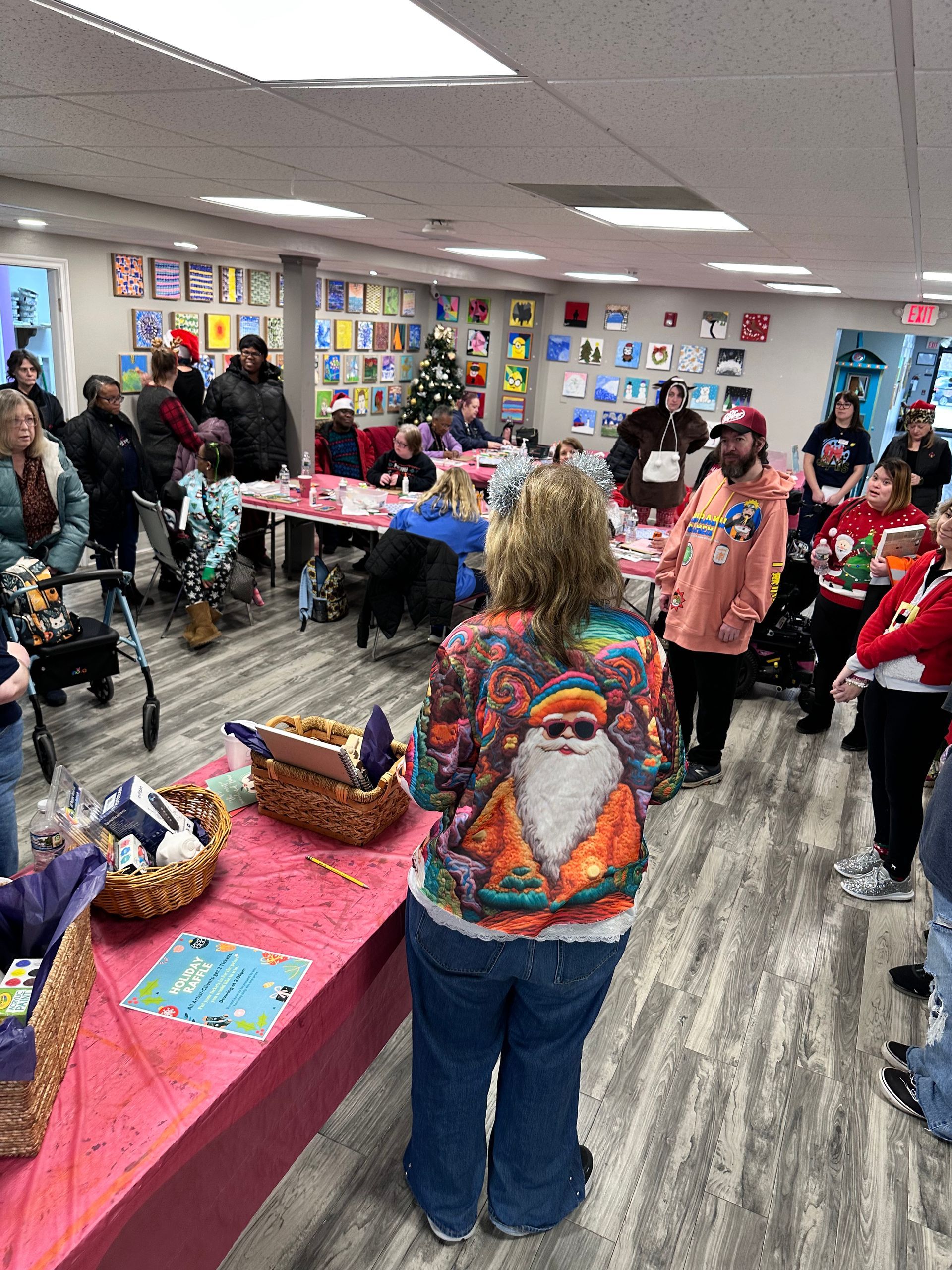 Our annual Artist-Client Holiday Party was a joyous occasion for everyone involved. With Papa John's pizza served for lunch, it was a surefire way to keep everyone satisfied and happy. Santa arrived, and the artist-clients were excited to spend time with him and present their Christmas lists. Fuyao Glass America graciously contributed several boxes of Lindt chocolates to be distributed among all the artist-clients and staff members adding a sweet note the the festivities. Every year the artist-clients eagerly anticipate the gift bags generously donated by Mighty Fortress Lutheran Church ELCA. Each bag is filled with a range of items, including personal care products and other necessities for them to take home.
