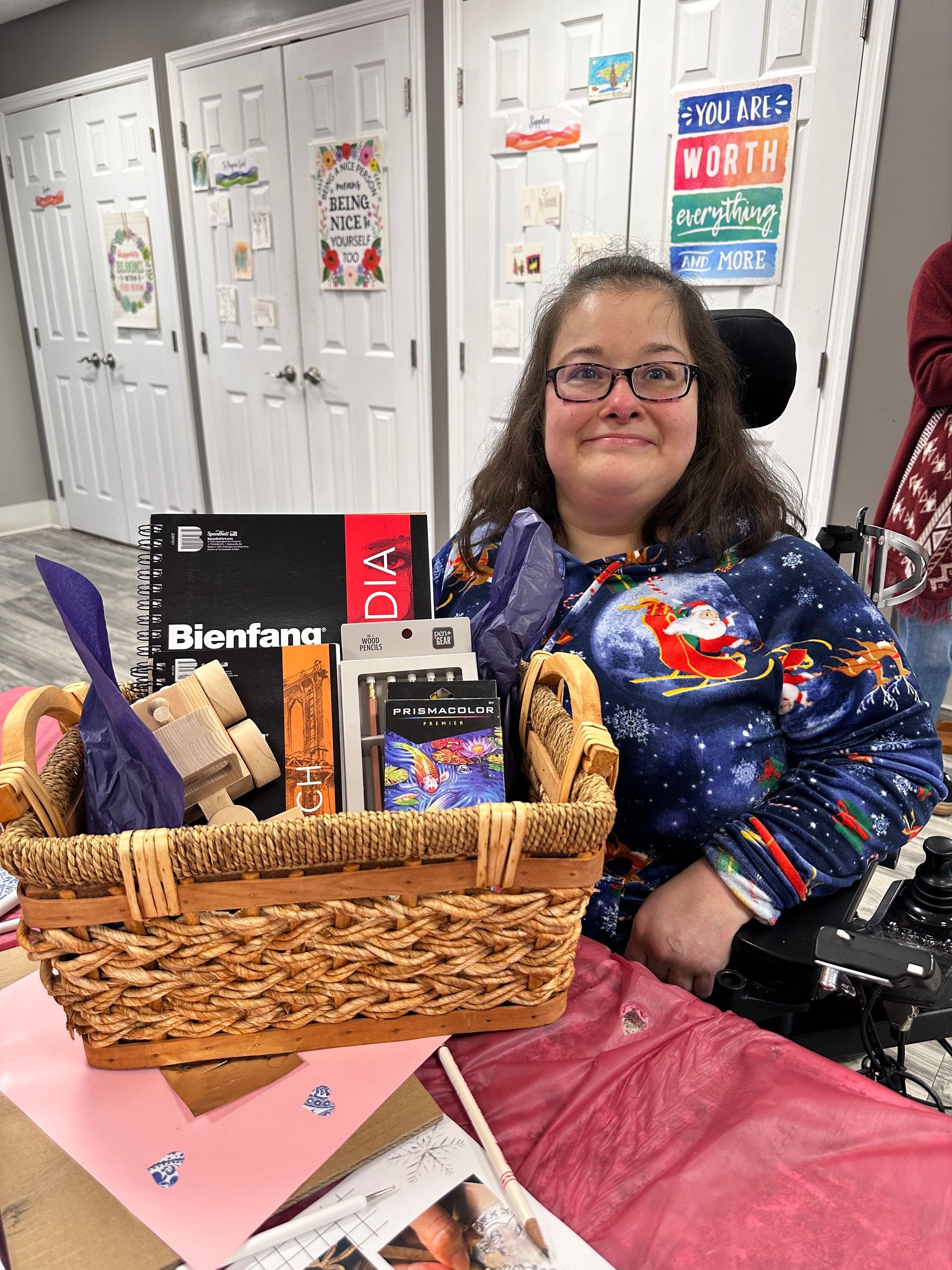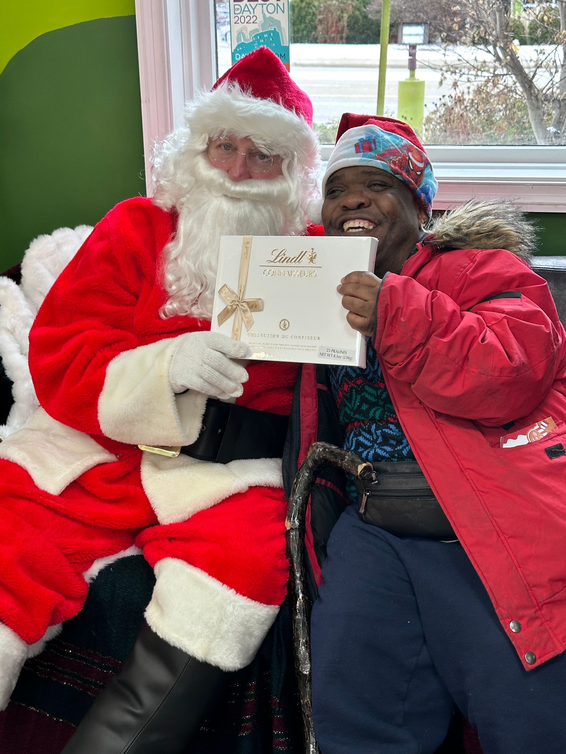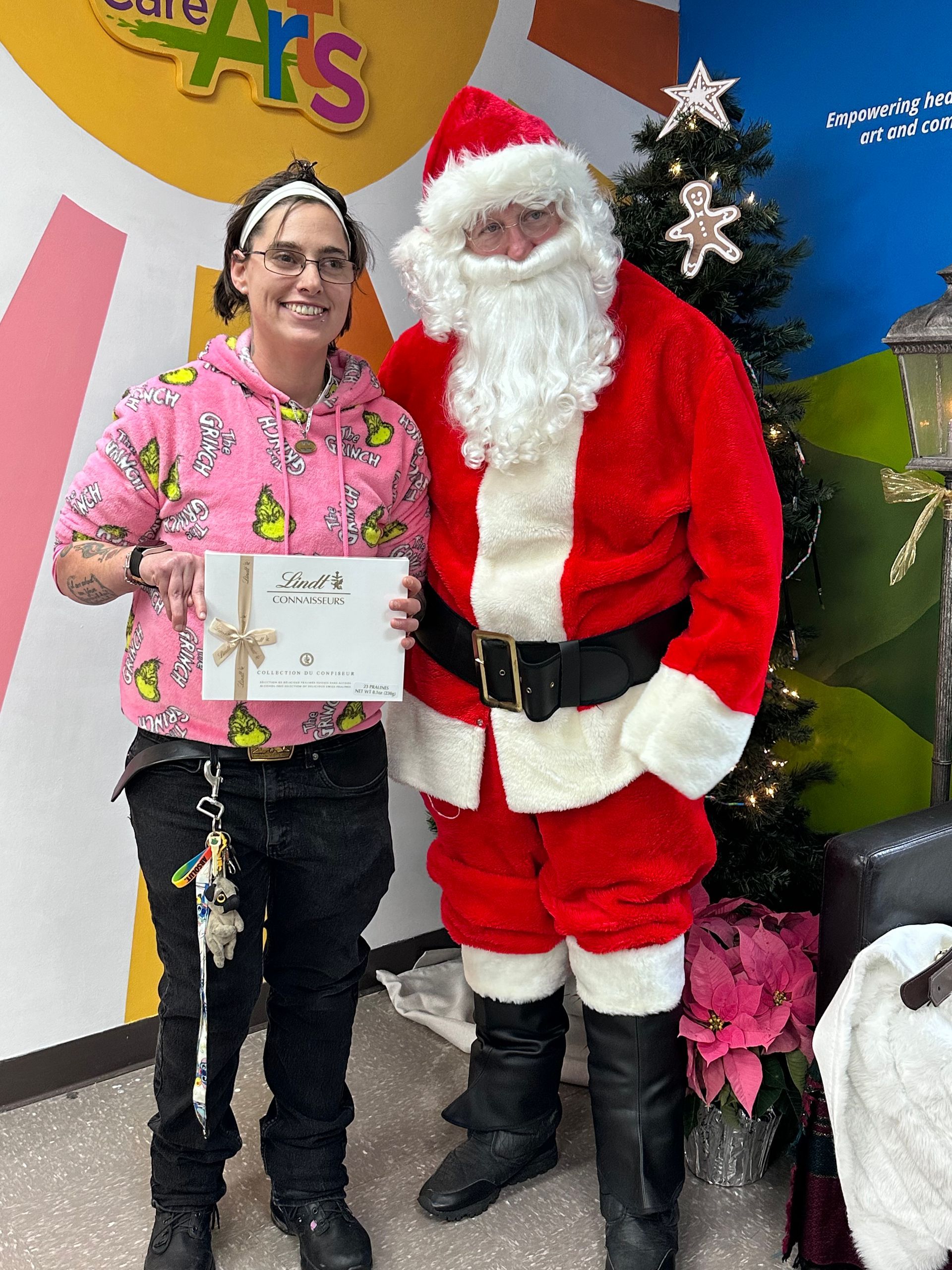 Our annual Artist-Client Holiday Party was a joyous occasion for everyone involved. With Papa John's pizza served for lunch, it was a surefire way to keep everyone satisfied and happy. Santa arrived, and the artist-clients were excited to spend time with him and present their Christmas lists. Fuyao Glass America graciously contributed several boxes of Lindt chocolates to be distributed among all the artist-clients and staff members adding a sweet note the the festivities. Every year the artist-clients eagerly anticipate the gift bags generously donated by Mighty Fortress Lutheran Church ELCA. Each bag is filled with a range of items, including personal care products and other necessities for them to take home.