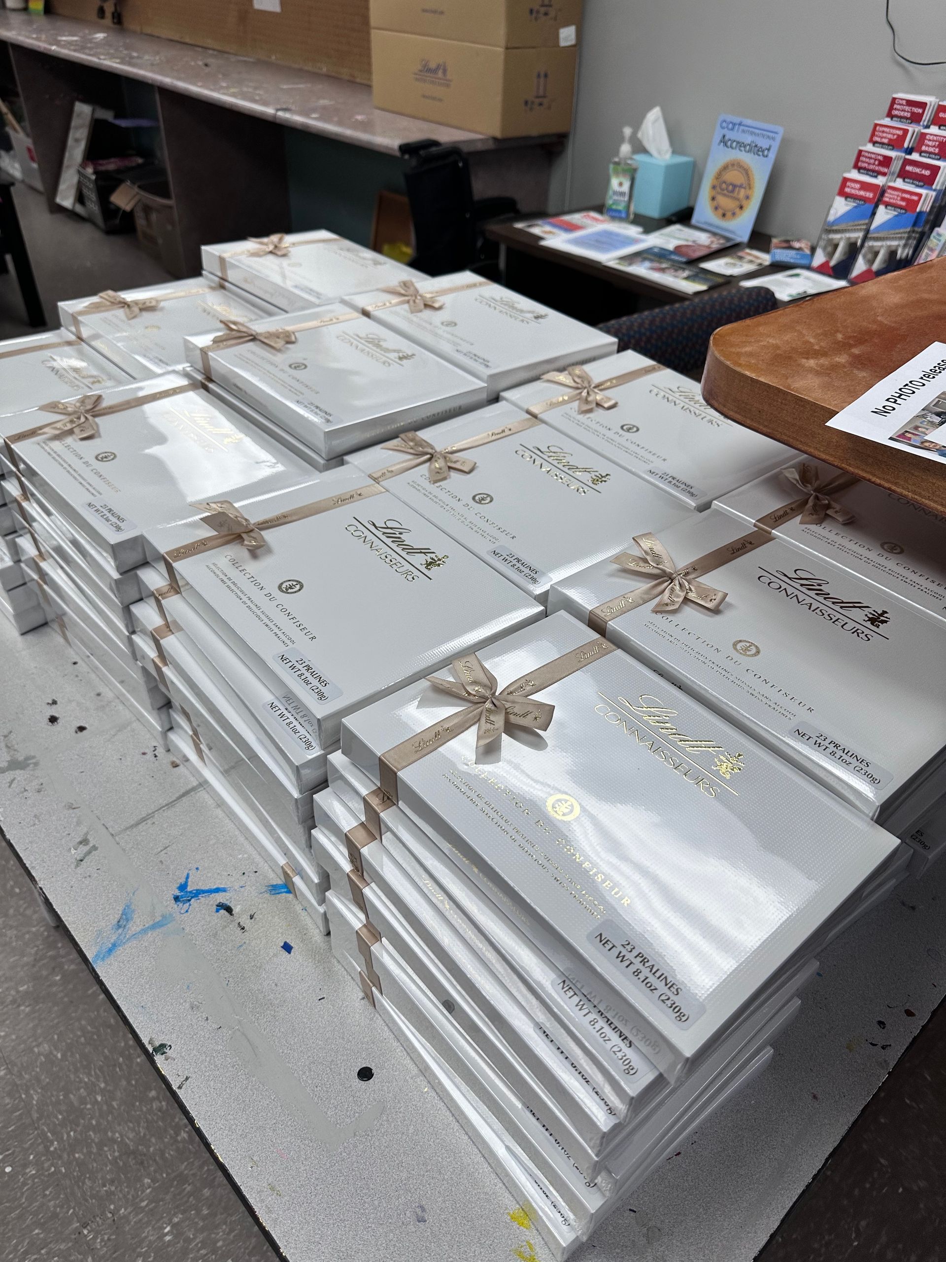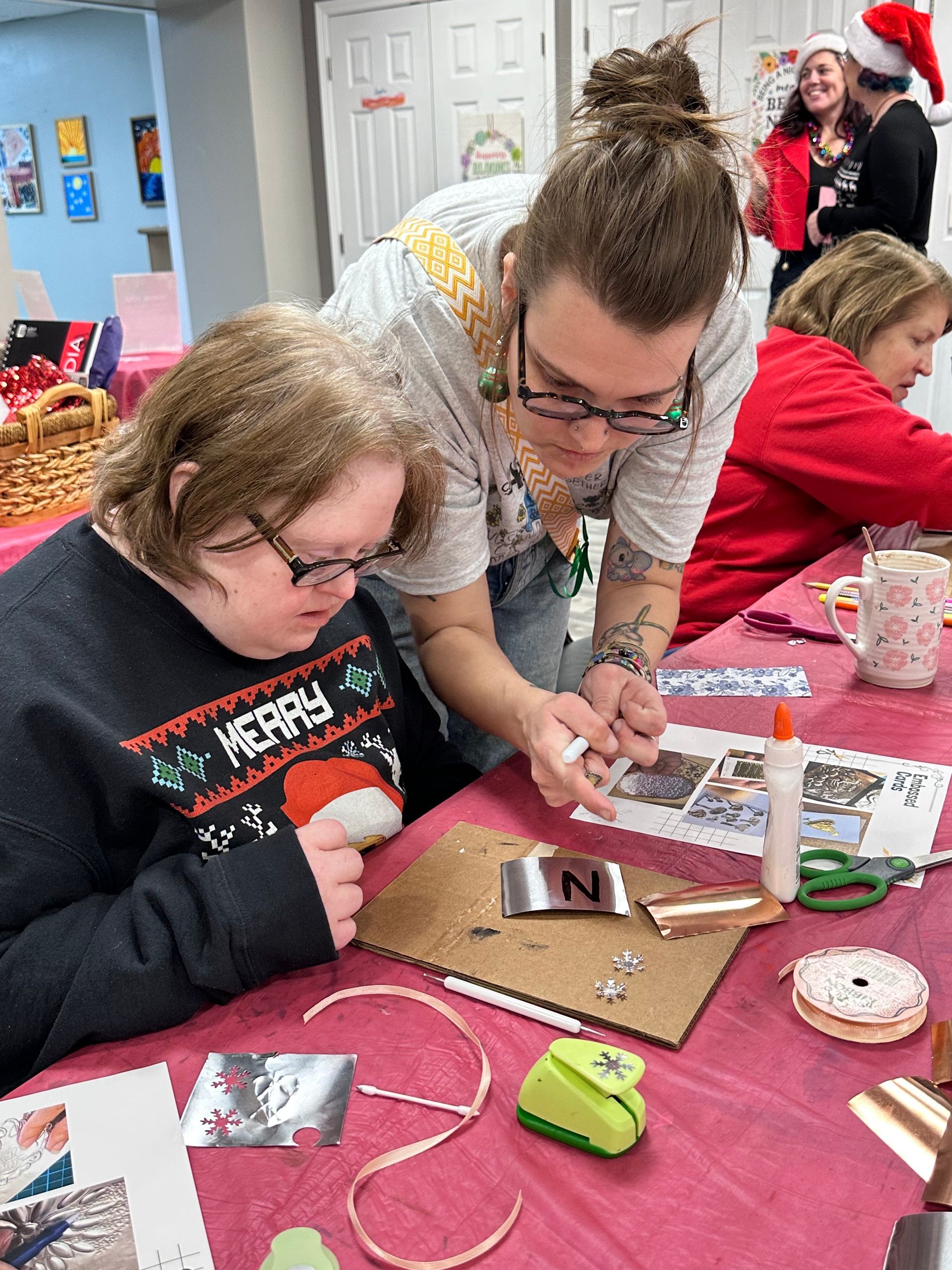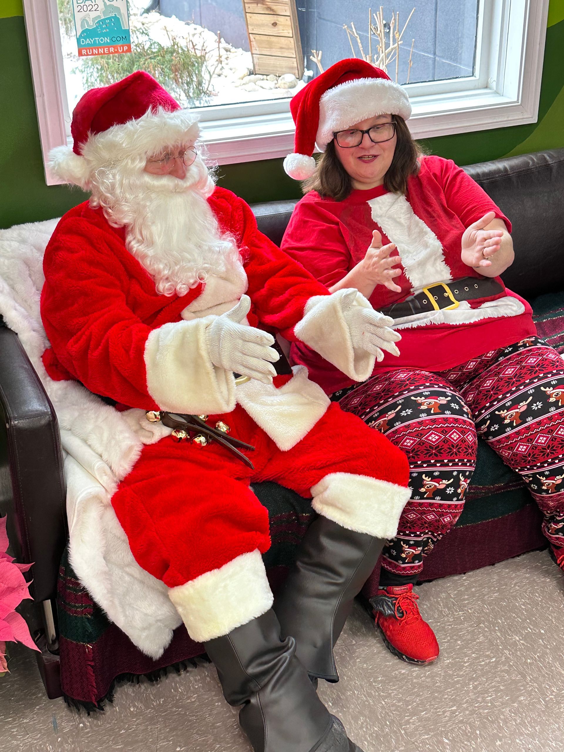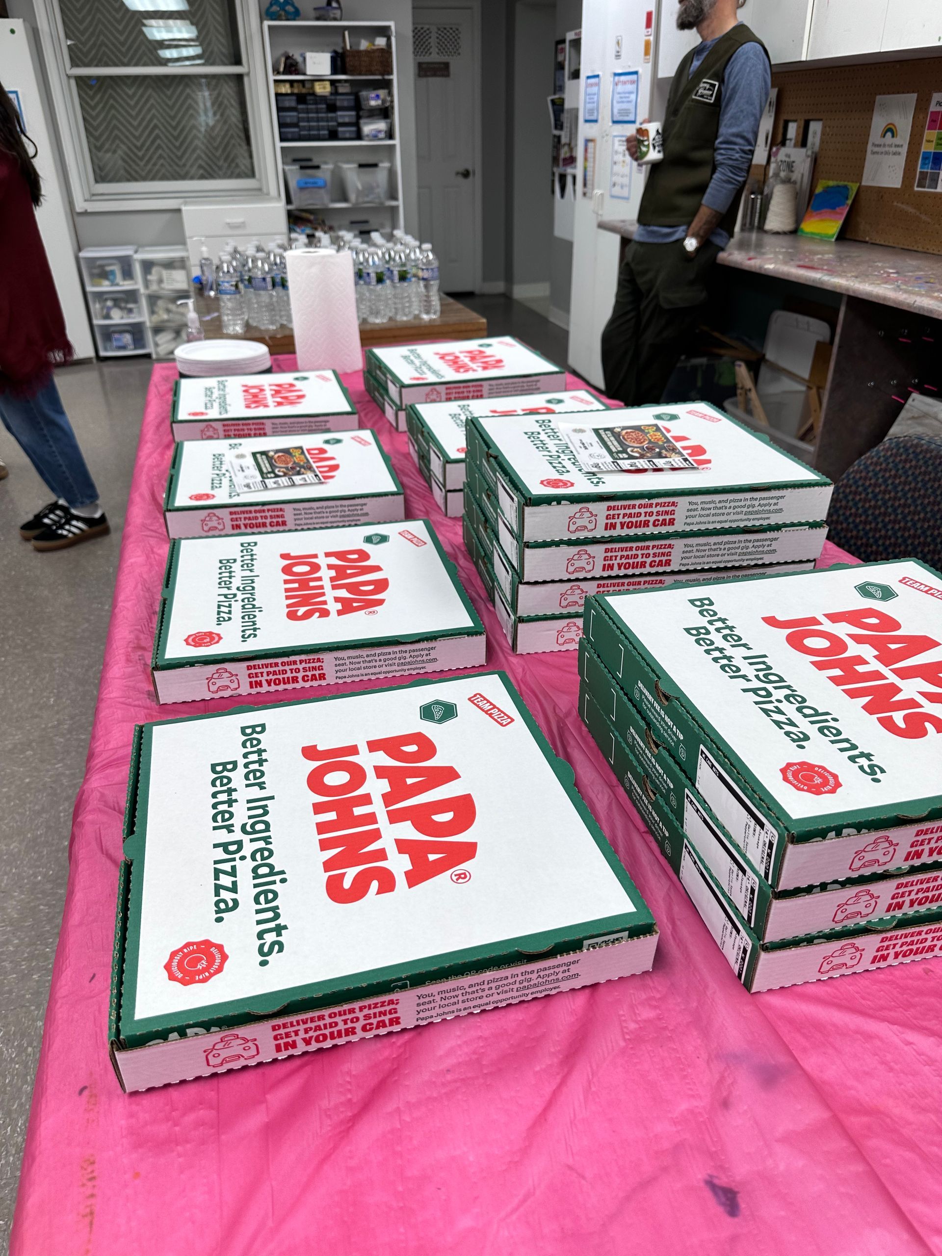 Our annual Artist-Client Holiday Party was a joyous occasion for everyone involved. With Papa John's pizza served for lunch, it was a surefire way to keep everyone satisfied and happy. Santa arrived, and the artist-clients were excited to spend time with him and present their Christmas lists. Fuyao Glass America graciously contributed several boxes of Lindt chocolates to be distributed among all the artist-clients and staff members adding a sweet note the the festivities. Every year the artist-clients eagerly anticipate the gift bags generously donated by Mighty Fortress Lutheran Church ELCA. Each bag is filled with a range of items, including personal care products and other necessities for them to take home.